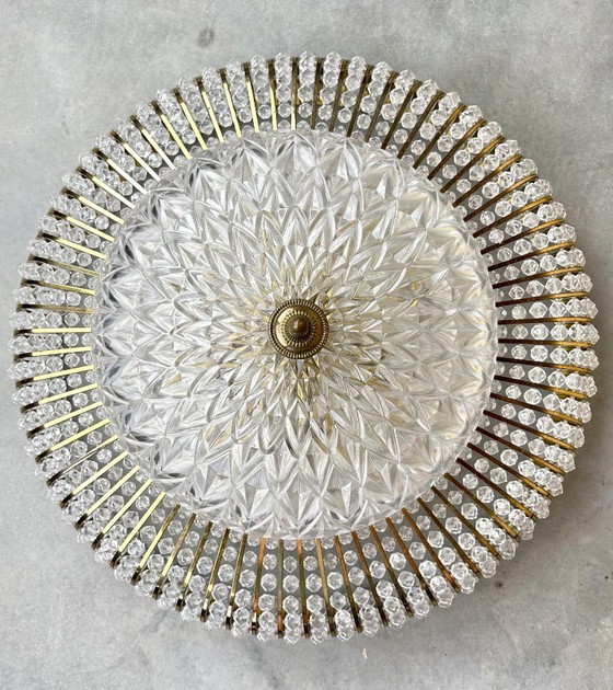 Mooi mid century design. Jaren 70 wand of plafondlamp ontworpen door Emil Stejnar voor het Oostenrijkse bedrijf Rupert Nikoll. Ronde glazen kern met hierrond acryl pareltjes opgelegd in messing bogen. De basis van de lamp is een chrome schijf met 8 lampen.