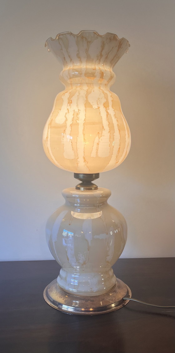 Deze vintage glazen lamp heeft een prachtig crème en goud gemarmerd ontwerp, aangevuld met messing accenten. De elegante vorm en warme gloed maken de lamp een perfecte aanvulling op elke klassieke of vintage-geïnspireerde inrichting. De lamp is in goede staat, met kleine gebruikssporen die het karakter versterken.