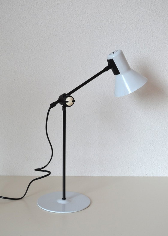 Deze originele Veneta Lumi bureaulamp uit de jaren '80 combineert vintage charme met functionaliteit. Het metalen ontwerp straalt een tijdloze elegantie uit en past perfect in zowel moderne als klassieke interieurs. De lamp is in goede staat met enkele kleine gebruikssporen.