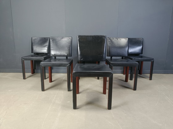 Set van 6 postmoderne eetkamerstoelen van Durlet met een elegant frame van hoogwaardig leer en hout en een bekleding van zwart leer.