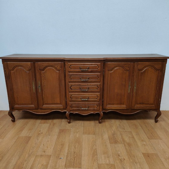 Vintage Wandkast XL. Deze buffetkast is in Queen Ann stijl en heeft prachtig houtsnijwerk en sierlijke poten. Deze Louis XV wandkast heeft in totaal vier deurtjes met daartussen vijf ruime lades. Alle deurtjes hebben een werkend slot op het rechter deurtje na. Dat slotje wil de ene keer wel en de andere keer niet. De kast heeft vier sloten en in totaal twee sleutels. Een prachtige kast om je interieur helemaal mee af te maken. In het bovenblad zitten in het midden twee kleine gaatjes. Hier zijn duidelijk foto’s van gemaakt.