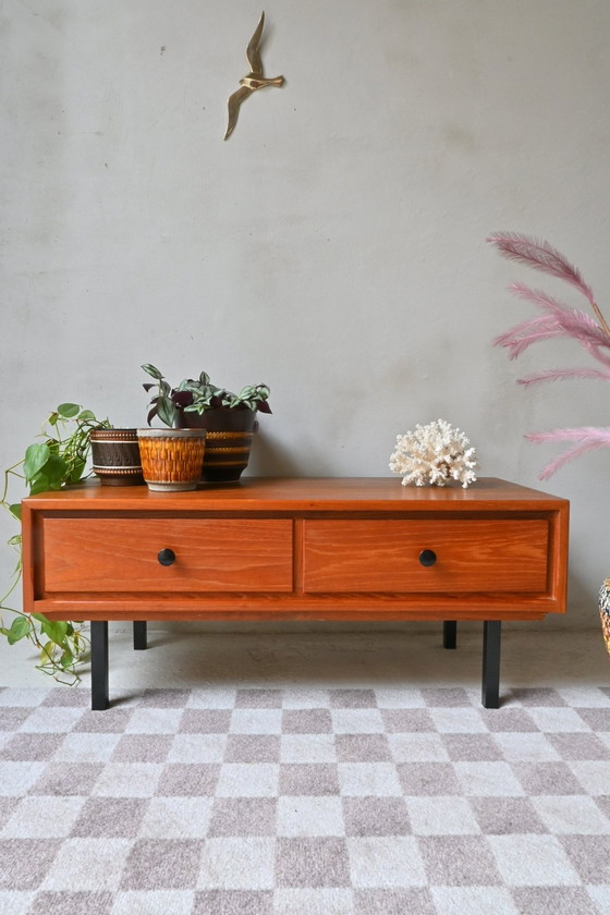 Stijlvol en functioneel vintage lowboard uit de jaren ’60-’70, uitgevoerd in warm teak fineer met een strak, minimalistisch design. Dit lage dressoir is voorzien van twee lades. Dankzij het lage profiel is het een perfect audiomeubel of een blikvanger onder een kunstwerk, een echte aanwinst voor liefhebbers van mid-century modern stijl.