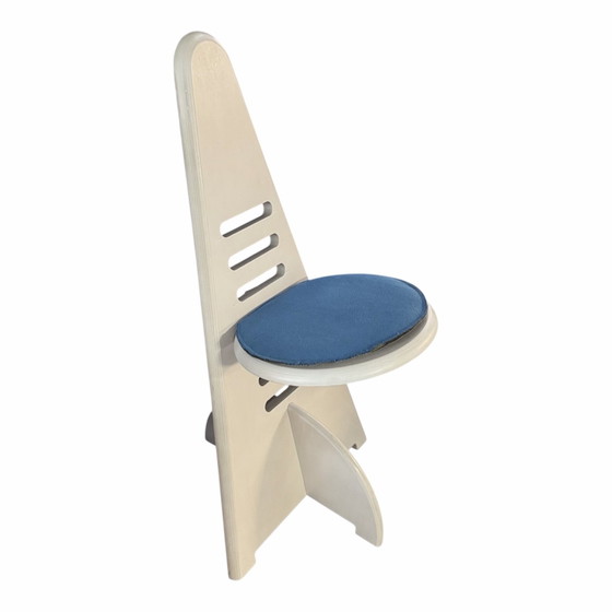 Deze postmoderne stoel heeft een prachtige geometrische vormgeving: hij bestaat uit een driehoek, een cirkel en een halve cirkel. De ronde zitting kan op verschillende hoogtes in de rugleuning gestoken worden en geborgd met een pen. Hierdoor kun je deze stoel altijd en overal gebruiken. Supermultifunctioneel!