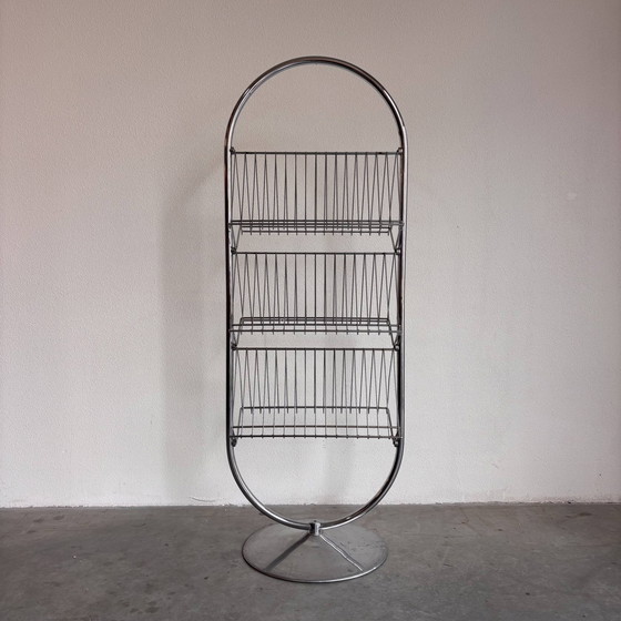 This is a vintage magazine rack designed by Verner Panton, featuring a sleek and stylish metal construction. Its silver finish and unique design make it a standout piece for any room. Perfect for organizing and displaying your favorite magazines, this rack combines functionality with a touch of retro elegance.