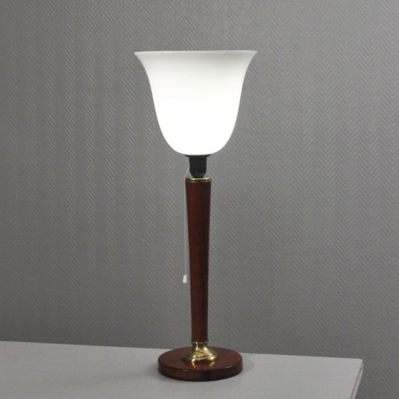 Vintage Mazda-lamp van hout, messing en opaalglas, Art Deco-design, 20e eeuw.