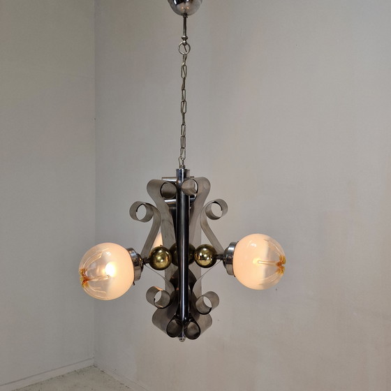 Verhoog je ruimte met deze opvallende vintage hanglamp van Mazzega Murano, gemaakt in Italië rond 1970. Deze prachtige armatuur heeft een gestroomlijnd metalen frame gecombineerd met drie handgeblazen Murano glazen bollen, elk met de kenmerkende organische wervelpatronen die de kunstzinnigheid van Venetiaans glas definiëren.