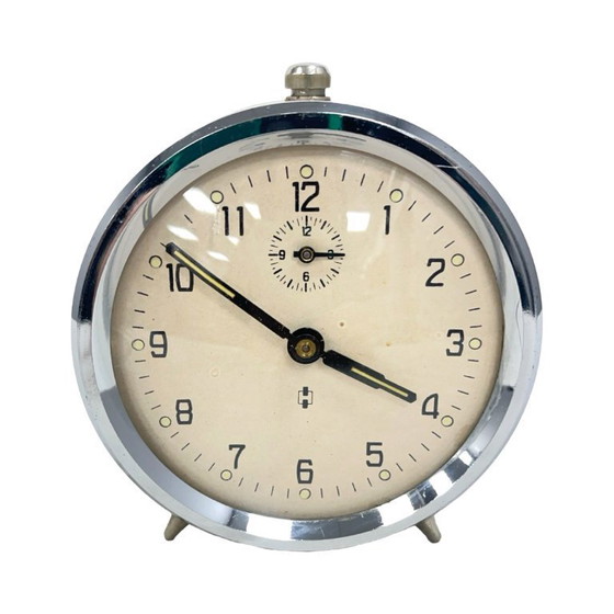 Een stijlvolle vintage mechanische wekker uit de jaren 60/70, in een klassieke crèmekleurige behuizing met een chromen frame. Deze tijdloze retro wekker, vervaardigd in Duitsland voor Haller, is perfect voor de inrichting van een modern interieur in communistische stijl, mid-century modern of loftstijl.