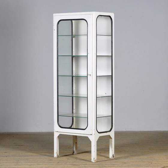 Deze medische kast is ontworpen in de jaren 70 en geproduceerd rond 1975 in Hongarije. Hij is gemaakt van ijzer en glas en heeft nieuwe glazen planken. Het glas wordt vastgehouden door een zwarte rubberen strip. De kast heeft vijf verstelbare glazen planken en een werkend slot.