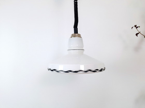 Een prachtige hanglamp gemaakt in de jaren 70. De kroonluchter heeft een prachtig melkglas met zwarte versiering.