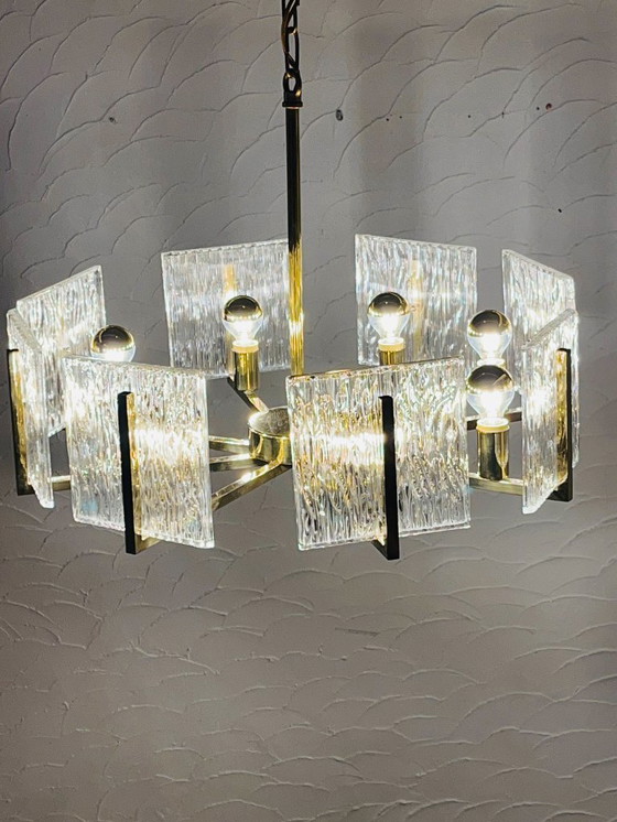Dit is een prachtige messing kroonluchter uit de jaren 70 met een elegant ontwerp met acht armen. Elke arm is versierd met een plaat van 15 x 15 centimeter met ijsglaseffect, met een reliëf dat een verfijnde, ijzige uitstraling geeft.