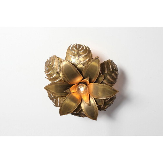 Vintage messing palmboomkroonluchter. Met de hand gehamerd messing armatuur met een patina. Kan gebruikt worden aan het plafond of aan de muur. Frankrijk, jaren 1970