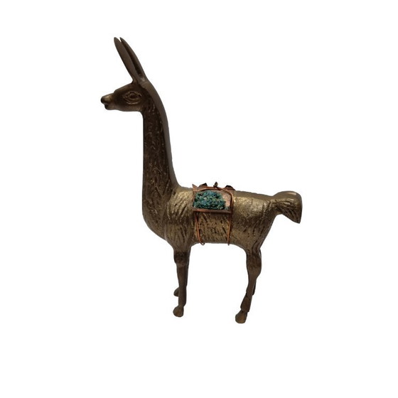 Vintage messing lama uit Peru met turquoise stenen, 2e helft 20e eeuw. Decoratief Zuid-Amerikaans beeldje met mooie patina. Een paar steentjes missen.