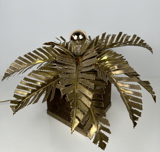 Vintage messing palm tafellamp uit de jaren 70 met één lamp. Bakelieten E27 fitting. Messing blaadjes (waarvan er één bladpunt aan de achterzijde ontbreekt, maar gelukkig niet opvallend, zie laatste foto). Origineel. Geen reproductie. Het internet verwijst naar Maison Jansen. Diameter: 60 cm. Hoogte: 30 cm. Gewicht: 4 kg. Onmisbaar voor een Hollywood Regency interieur. Zoals gebruikelijk, niet gelabeld. Exclusief spiegellamp (overal verkrijgbaar in led-uitvoering).