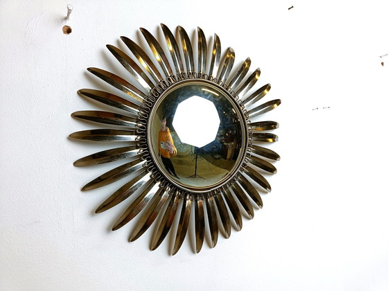 Mid Century Messing Sunburst of Bloem spiegel met Convex glas.