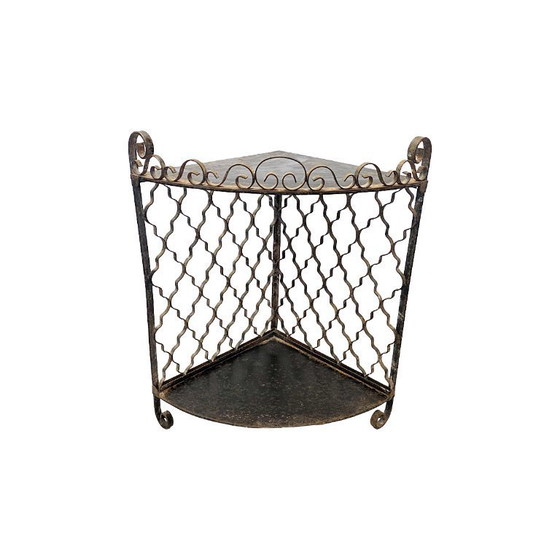 Vintage metalen hoek étagère, afkomstig uit het midden van de 20e eeuw. Leuke en decoratieve metalen hoek étagère met 2 verdiepingen. De zijkanten zijn in vorm van quatrefoil motief en geven extra charme. Rondom wat verweerd door de jaren wat een extra patina geeft.