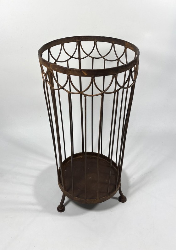 Stijlvolle, antieke parapluhouder van robuust metaal met een filigraan staafontwerp en decoratieve ronde bogen aan de bovenrand. De ronde vorm staat op drie kleine pootjes en zorgt voor een stevige stand.