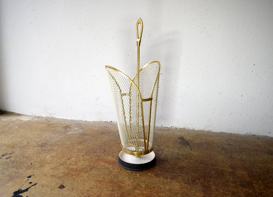 Stap terug in de tijd met deze prachtige vintage metalen paraplubak uit de jaren 1950. De elegante gouden afwerking en het ingewikkelde gaasontwerp maken het een opvallend stuk voor elke entree of gang. Door vorm en functie perfect te combineren, dient deze paraplubak niet alleen een praktisch doel, maar voegt hij ook een vleugje Mid Century charme toe aan je interieur. Hij is gemaakt van duurzaam metaal met een verfijnde gouden afwerking en heeft een uniek gaasontwerp dat de vintage uitstraling versterkt. Ideaal om paraplu's in op te bergen en tegelijkertijd een decoratief element aan je ruimte toe te voegen. Verfraai je huis met dit tijdloze stuk dat nut combineert met klassieke stijl.
