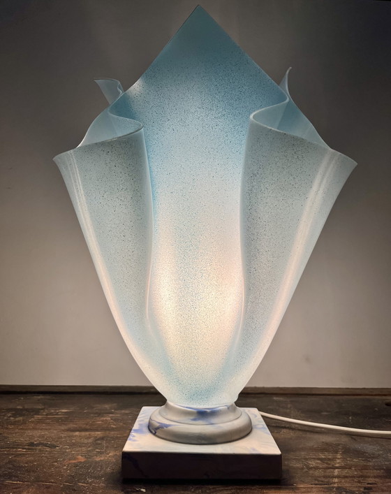 Vintage mid century Georgia Jacob style lamp, unieke hand gevormde lamp gemaakt van gekleurd perplex. Gemaakt in de jaren 70 in Frankrijk, met een prachtige licht blauwe kleur dat dat een typische Parisian chic heeft De lamp is zowel aan als uit een aandacht trekker, typisch Franse mid century met een bijzondere blauw geaderde resin voet van 12cm. De lamp is 37cm hoog en 30cm breed, E14 fitting en ca135cm snoer met schakelaar