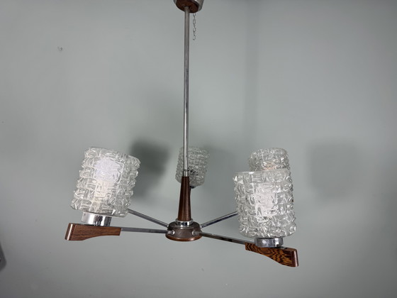 Vintage Mid Century Kroonluchter Teak Met Glazen Kapjes
