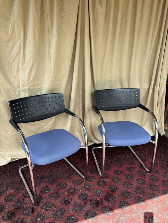 Deze vintage mid-century vergaderstoelen van Vitra zijn een prachtige aanvulling op elke eetkamer. Ze hebben een stijlvol ontwerp met een metalen frame en comfortabele blauwe textiele zittingen. De stoelen zijn stevig en duurzaam, met een tijdloze uitstraling die perfect past bij een mid-century modern interieur. Het zwarte plastic van de rugleuning voegt een modern tintje toe aan het klassieke ontwerp.