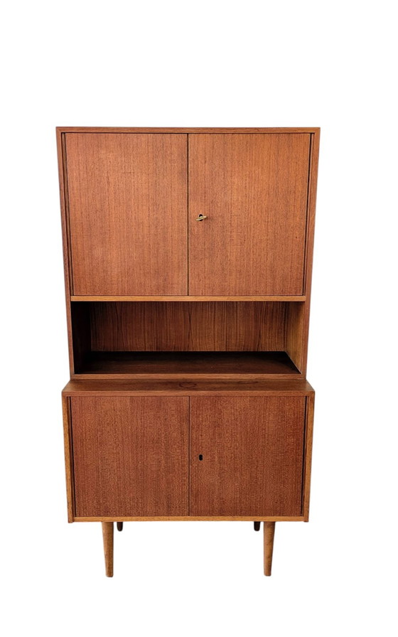 Het onderste gedeelte is 43cm diep staat op leuke conische poten en heeft 2 deurtjes met daarachter een plank. Er is 1 sleutel aanwezig.