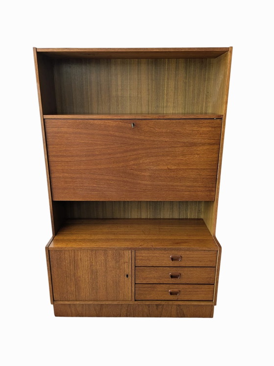Mooie vintage retro kast, met klep, te gebruiken als secretaire of bv als barkast. De ruimte achter de klep biedt sowieso veel opbergruimte evenals de laatjes en het kastje. De 3 laatjes hebben mooi vormgegeven handgreepjes.
