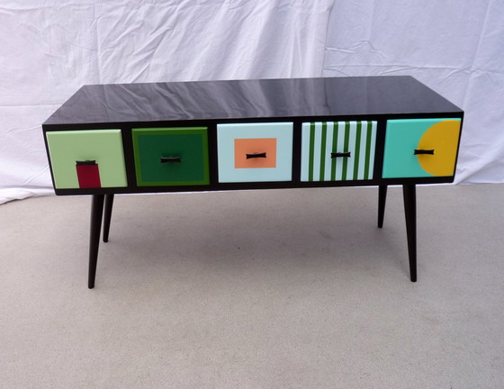Mini ladekastje gemaakt van houten kaartenbakjes uit de jaren 60. Het bevat 5 kleine laden van L. 38 cm en B. 17 cm. Glanzend zwart laminaat bovenblad. Gekleurde gelakte laden en sokkel. Op 4 passerpoten (niet demonteerbaar).