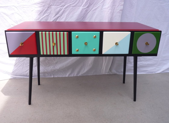 ConditieUitstekendKleurenRood, Meerdere kleuren, ZwartMateriaalHoutAantal stuks1Hoogte62 cmBreedte105 cmDiepte45 cm