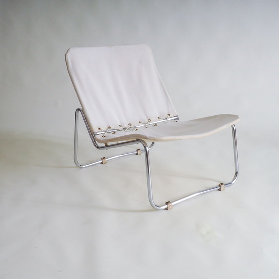 Minimalistische vintage loungestoel met een buisframe van gepolijst chroom en een zitting en rugleuning van witte stof.
