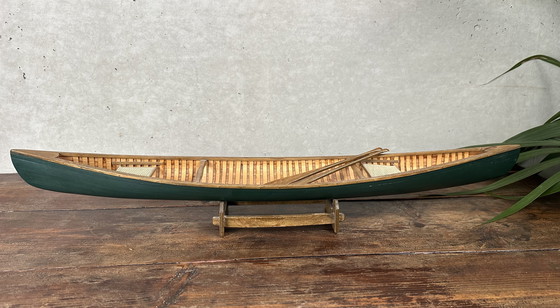 Vintage model van een kano. Hout. Inclusief 2 gevlochten zitjes, 2 peddels en een steuntje. Mooi gedetailleerd. Lengte: 70cm. Breedte: 12cm. Hoogte: 7cm. Zeer strak model en mooi decoratief in elk interieur.