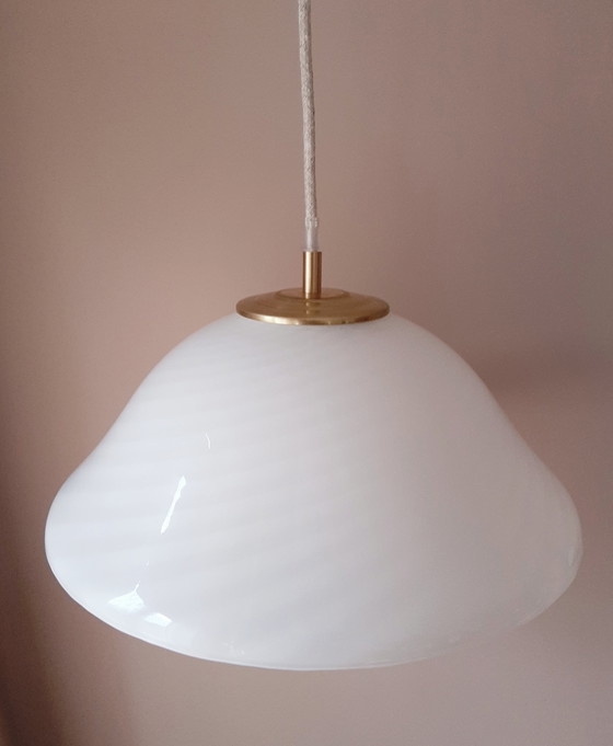 De halfronde kap van Muranoglas is voorzien van diagonale opaallijnen die een uniek textuureffect creëren. Italië. Circa jaren 70.
