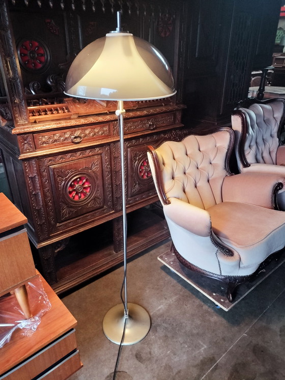 Vintage vloerlamp uit de jaren 70 met paddenstoelvormige kap in Space Age stijl. Geeft een warm, diffuus licht en is een echte blikvanger in een vintage of modern interieur.