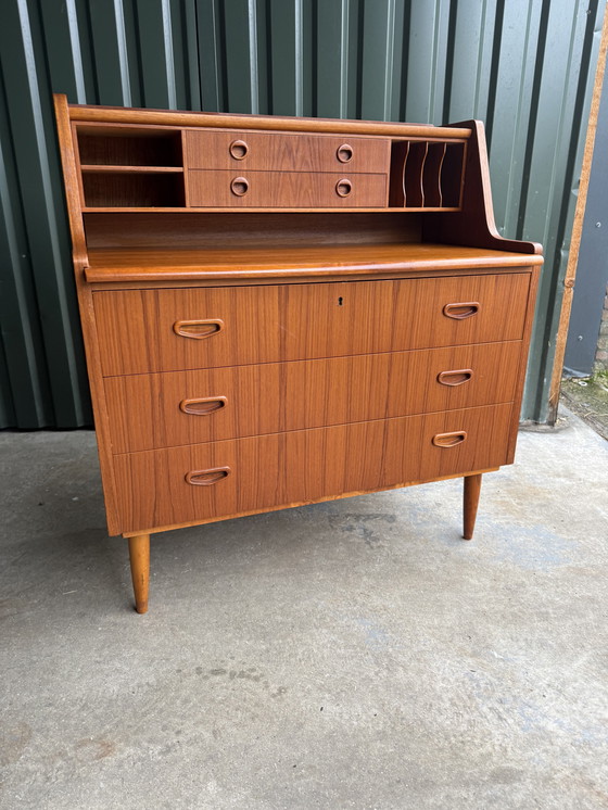 Vintage secretaire / bureau van Musterring gemaakt in de jaren '60. In hele goede vintage conditie lades kunnen allemaal open geleverd zonder sleutel. Heel klein stukje fineer lijkt te zijn gerepareerd op het linker zijpaneel onderin zie foto’s