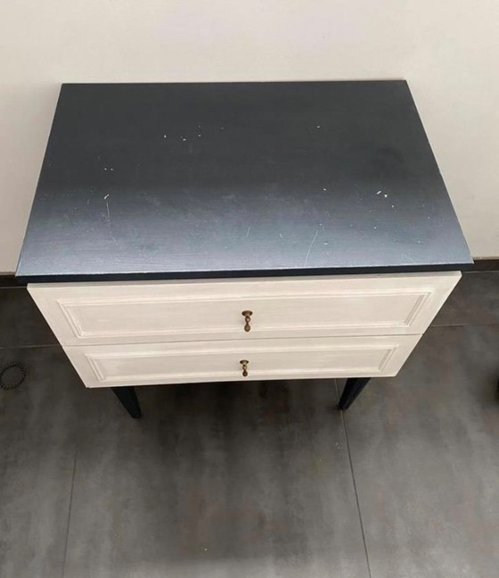 Dit charmante vintage nachtkastje voegt een vleugje elegantie toe aan elke slaapkamer. Met zijn tijdloze ontwerp en subtiele kleurencombinatie van zwart en wit, past het moeiteloos in diverse interieurstijlen. Het kastje is vervaardigd uit hoogwaardig hout en biedt praktische opbergruimte met zijn enkele lade, ideaal voor het opbergen van persoonlijke spullen naast uw bed. De verfijnde afwerking en het klassieke ontwerp maken dit nachtkastje een waardevolle aanvulling op uw interieur. Neem contact met ons op voor meer informatie of om dit prachtige stuk aan uw collectie toe te voegen.