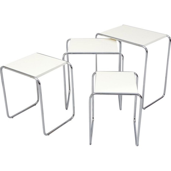 Volledig gerestaureerd door ons professionele opknapteam. Gemaakt van chroomstaal en gelakt hout.Elke tafel staat op een enkele lijn van chroomstaal en wit hout. Het heeft klassieke Bauhaus-designelementen zoals leer en chroomstaal, strak en modern.Let op: deze aanbieding is alleen voor zwarte nesttafels.