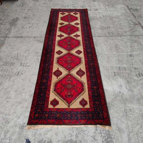 Deze vintage loper, of vloerkleedje in de kleuren rood blauw en zit vol details. De loper verkeert in een zeer goede vintage staat. Een geweldige sfeermaker in ieder interieur! Leuk als gang loper of in de keuken.