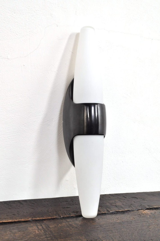 Prachtige, Bauhaus geïnspireerde, wandlamp uit de jaren 60, ontworpen en geproduceerd door het Belgische Bo-Niko. De grote, taps toelopende opaline glazen en bakelieten (bruin) lamp verkeert in goede staat en geeft prachtig licht!