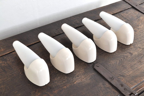 Prachtige, Bauhaus geïnspireerde, wandlamp uit de jaren 60, ontworpen en geproduceerd door het Belgische Bo-Niko. Het grote, taps toelopende opaline glas en bakelieten (creme!) lamp verkeert in goede staat en geeft prachtig licht!