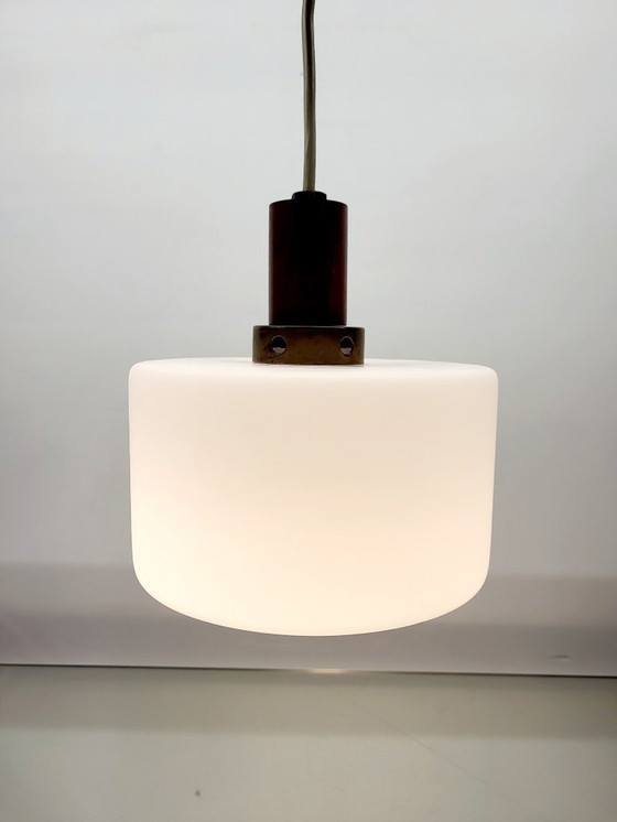 Vintage opaline glazen hanglamp, Scandinavische stijl, teak en messing, jaren 60