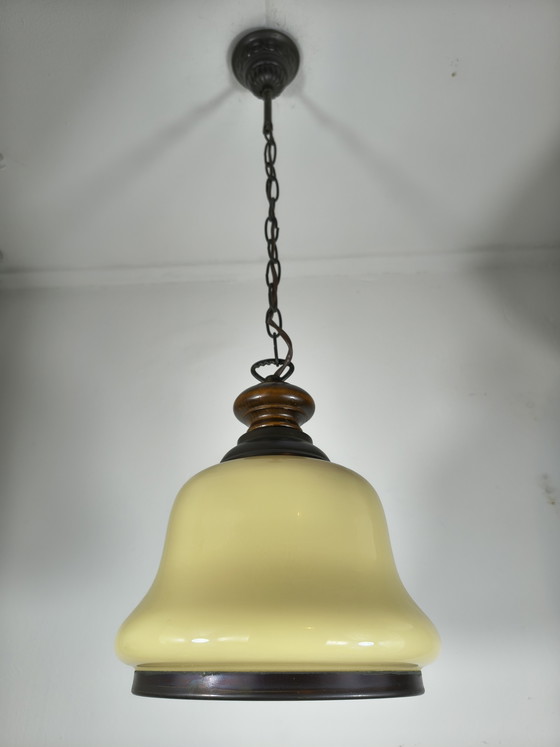 Vintage opaline hanglamp – gele glazen kap – jaren 30 stijl