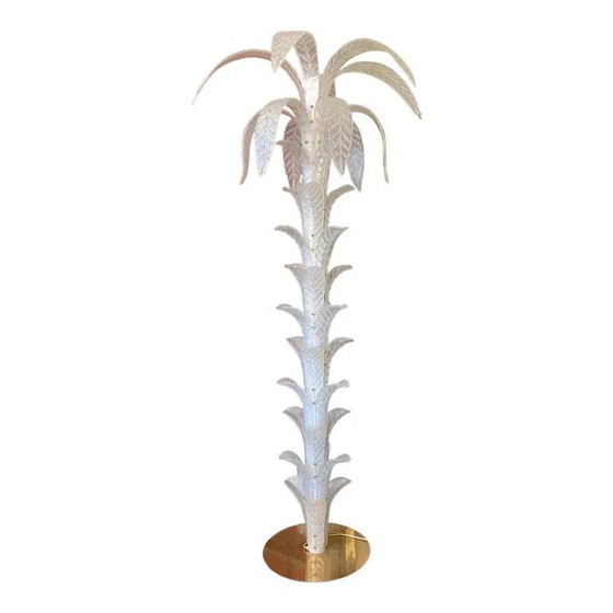 Mid-century moderne vloerlamp met palmboommotief van Muranoglas. Zeldzame opalinokleur, zeer elegant en luxueus. Metalen frame in wit en verguld. Vintage stijl uit de jaren 70. Extravagante vloerlamp van Muranoglas. Wordt ongemonteerd vanuit Italië verzonden, gemaakt van Muranoglas, met Murano-aanduiding. Zeer hoogwaardig Italiaans vakmanschap. Kan lichte tot matige gebruikssporen op de voet vertonen.