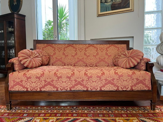 Massief houten frame en bekleed met een fijne stof, met een mechanisme waarmee hij gemakkelijk in een bed kan worden veranderd. Uitstekende staat.