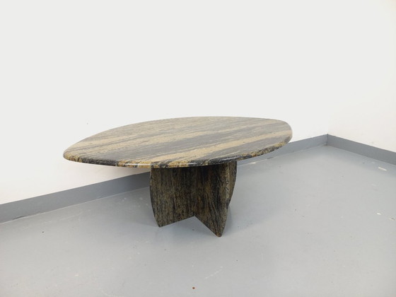 Vintage salontafel uit de jaren 70, met een dubbelzijdig of ovaal blad en een vierzijdige centrale poot. Gemaakt van marmer in prachtige tinten donkergrijs en greige, verkeert de tafel in zeer goede staat, met microscopische krasjes en oppervlakkige krasjes op het blad.