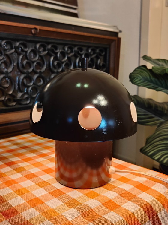 De koepelvormige kap heeft verschillende ronde uitsparingen. Deze openingen geven zicht op de binnenkant van de lamp en benadrukken de paddenstoelvorm. Door de gaten is de witte binnenkant zichtbaar, die het licht reflecteert en een warme gloed creëert.