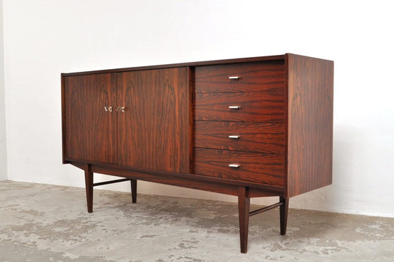 Stijlvol dressoir uit de jaren 60 met vier laden en twee deuren (wit achterpaneel). Het prachtige palissander straalt een bepaalde klasse uit! Mooie laden! Ook geschikt als tv-meubel.