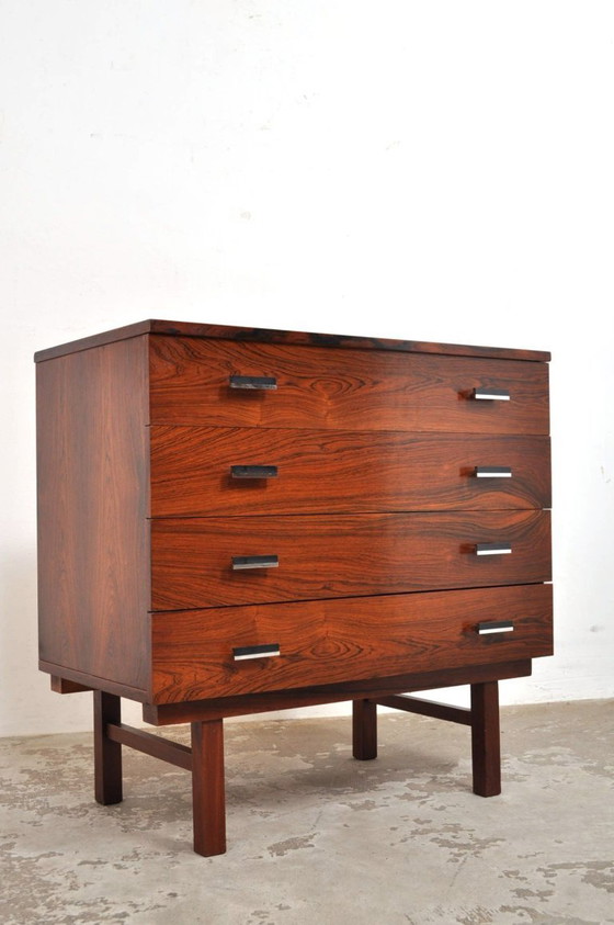 Stijlvolle vintage kast in palissander. Jaren 60. De kast heeft vier laden met prachtige grepen. In uitstekende conditie.