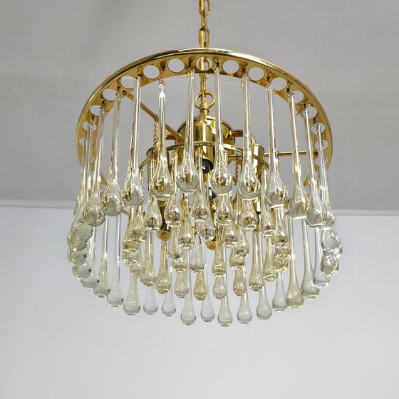 Elegante vintage plafondlamp van PALWA, uitgevoerd in messing met drie lagen glazen druppels.
