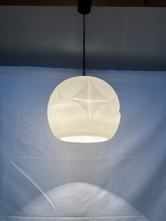 De lamp bestaat uit een geometrisch gevormde wit opaline globe met een chroom metalen armatuur. De lamp verspreid prachtig licht en is in uitstekende, originele en werkende staat. Geen barstjes of chips. De lamp heeft aan de binnenkant een merklabel.