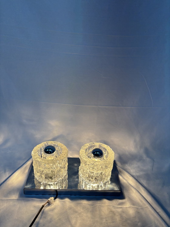Het dikke, handgegoten glas verspreid het licht op een unieke manier. Deze set staat op een strakke, verchroomde/spiegelende basis, wat zorgt voor een luxe en tijdloze uitstraling die perfect past in een Mid-Century Modern of Hollywood Regency interieur.