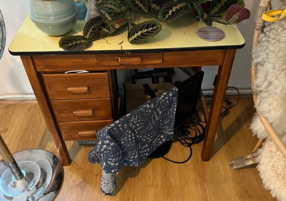 Het bureau heeft een geel/groen achtige formica blad en houten poten.